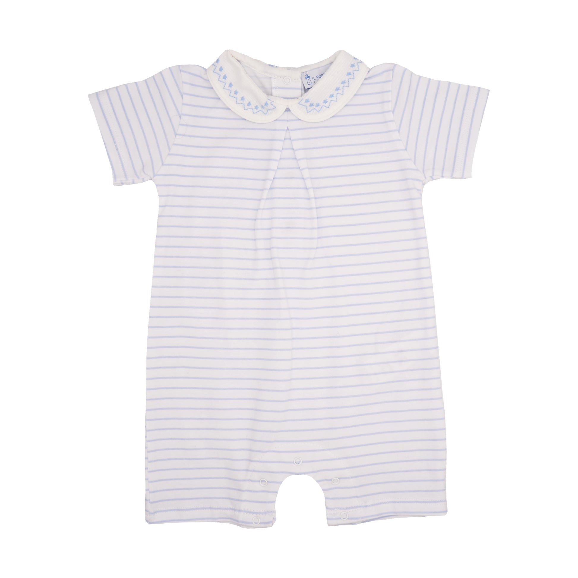 It features a beautifully embroidered round collar with intricate light blue stitching for an extra detail of charm, along with short sleeves for added comfort during warmer months. Practical snap buttons at the back and between the legs ensure easy dressing and fuss-free nappy changes. Made in Italy with love and care, this baby pyjama combines softness, elegance, and functionality—ideal for your little one’s first wardrobe.