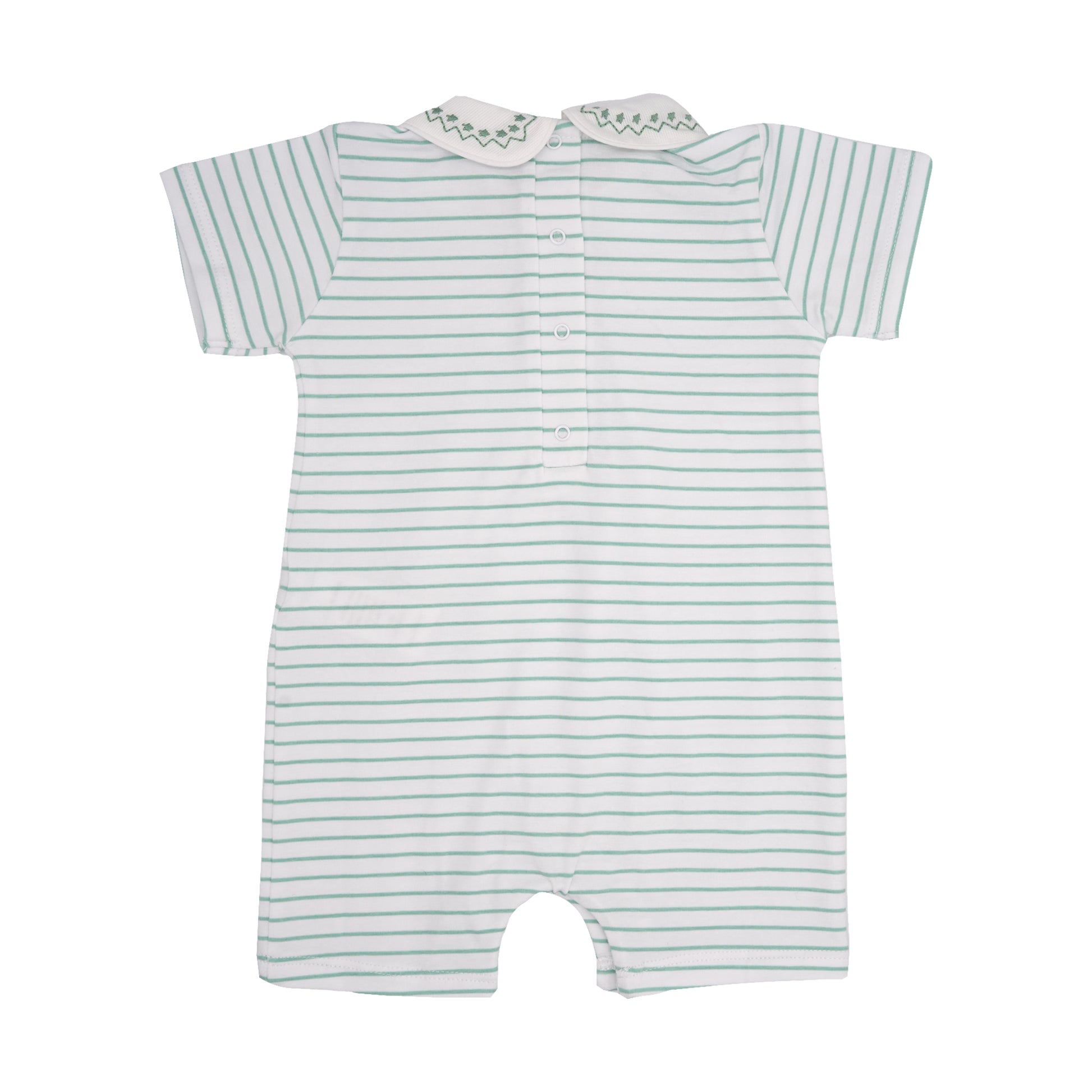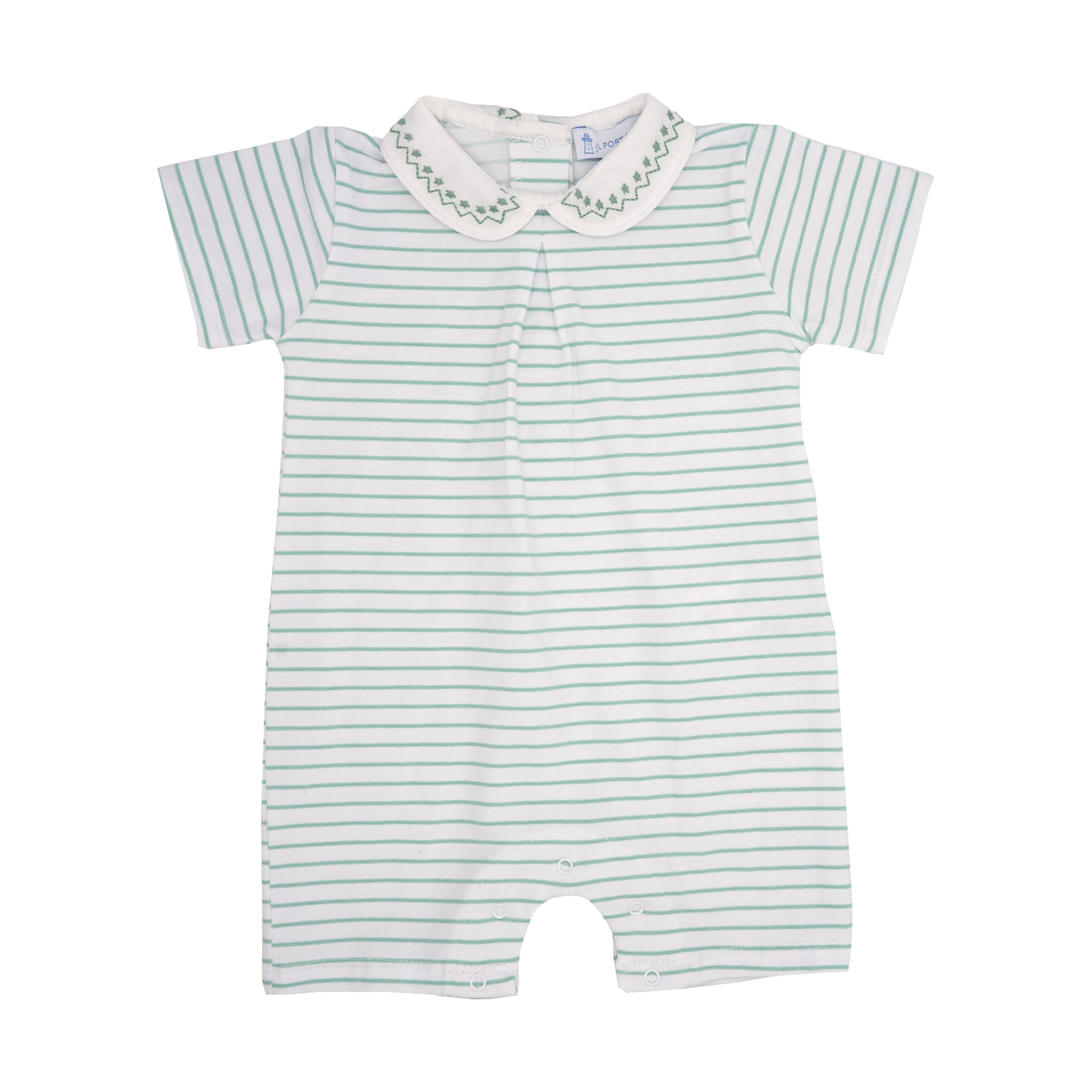It features a beautifully embroidered round collar with intricate green stitching for an extra detail of charm, along with short sleeves for added comfort during warmer months. Practical snap buttons at the back and between the legs ensure easy dressing and fuss-free nappy changes. Made in Italy with love and care, this baby pyjama combines softness, elegance, and functionality—ideal for your little one’s first wardrobe.