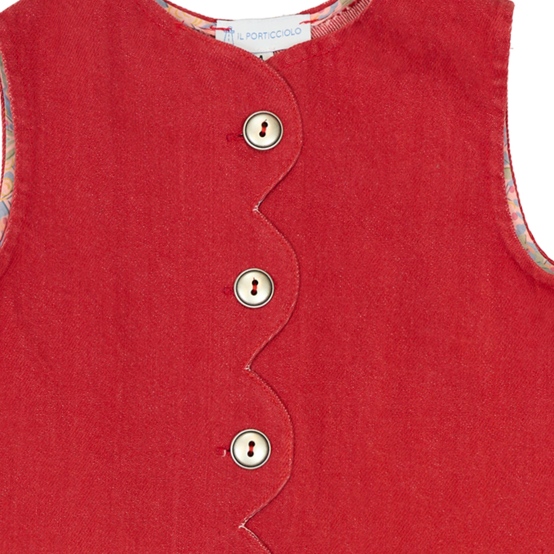The red hue of the denim fabric enhances its versatility, allowing for endless styling possibilities. Whether paired with sandals for a breezy summer look or layered with a cosy cardigan on cooler days, the Wave Dress is a must-have wardrobe staple. Expertly made in Italy, this piece matches the Wave Skirt and Overall in Red Jeans for a coordinated sibling outfit, making it a timeless and stylish choice for any occasion.