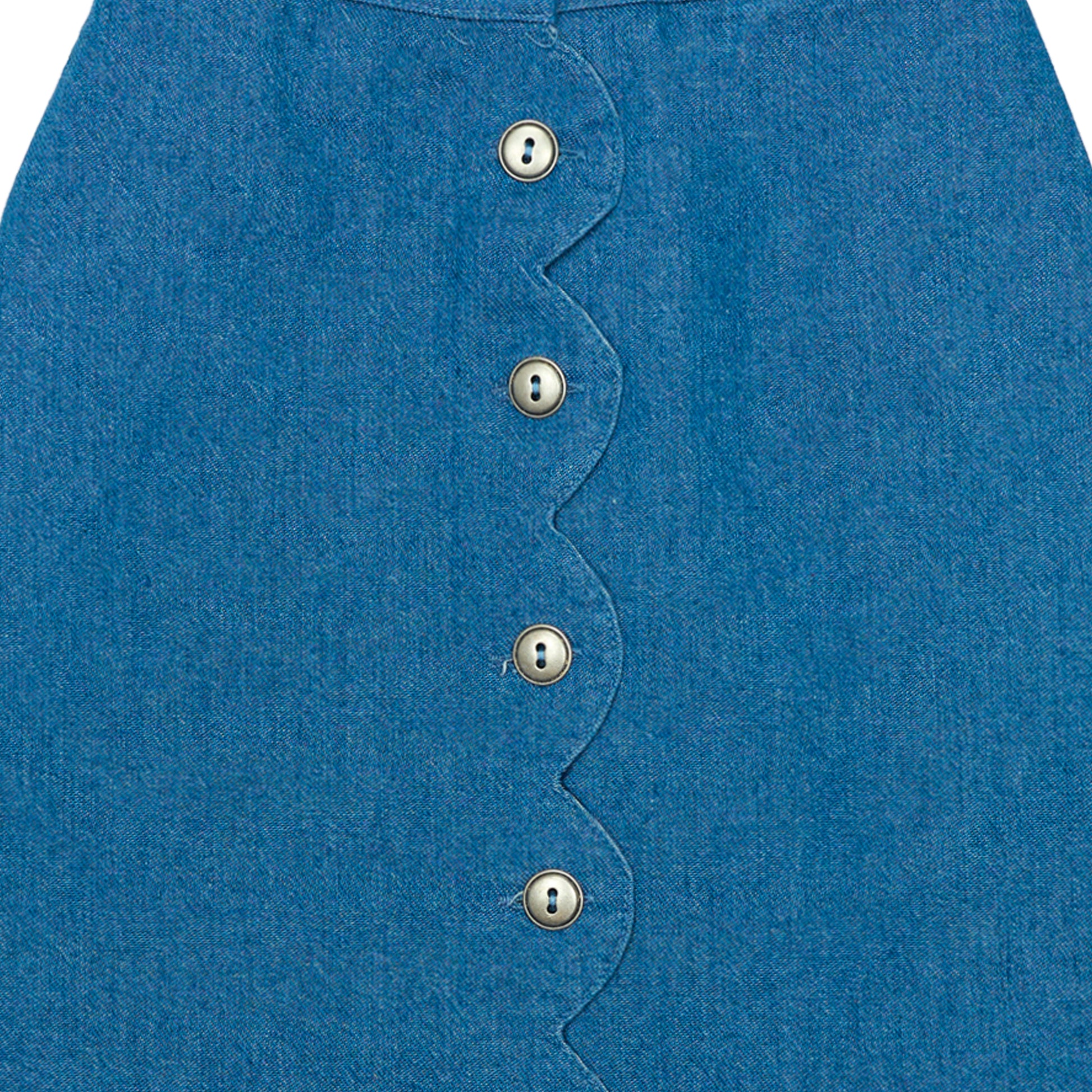 - Design: Skirt with front metal button line, soft denim texture, waved wrap-over edge